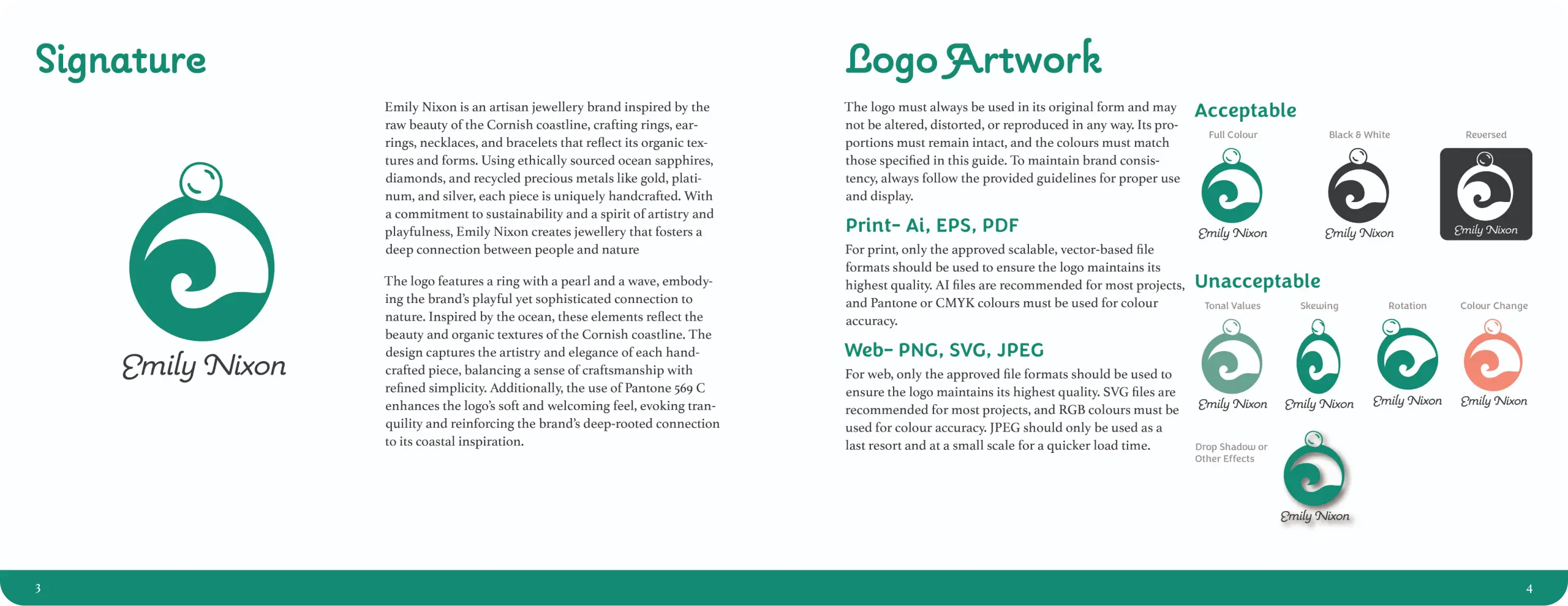 The final outcome was a refreshed visual identity that captures Emily Nixon’s coastal charm and artisanal spirit. The new logo, featuring a ring, pearl, and wave, reflects the brand’s connection to nature while maintaining a sense of elegance and simplicity. A soft blue palette and refined typography tie everything together, creating a warm and recognizable look. To ensure consistency, I developed a clear branding guide covering logo usage, colours, typography, photography, and digital presence. The redesigned website built on this foundation with clean layouts and inviting imagery that highlight the jewellery and share the brand’s story in a more engaging way. Together, these updates created a unified, authentic identity that helps customers instantly connect with who Emily Nixon is and what she represents.
